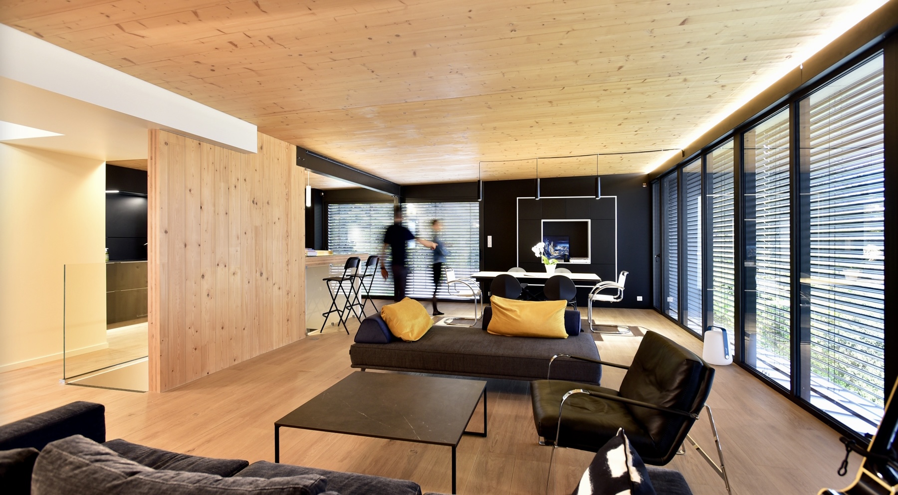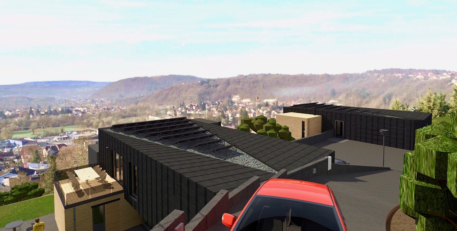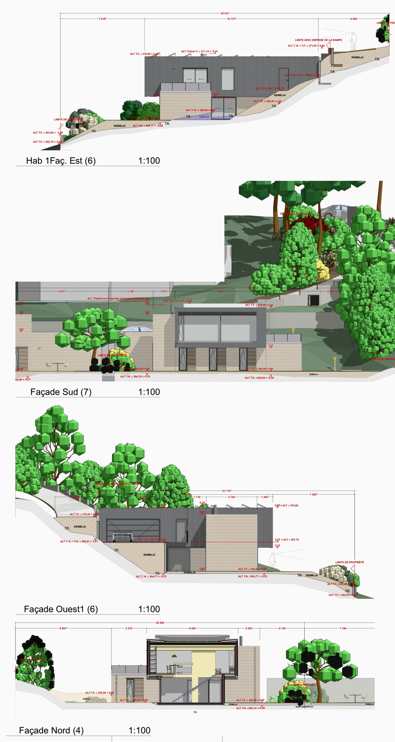 Détails des espaces mis en scène : Située sur le versant sud du coteau de Montbéliard cette bâtisse sécurisée, éloignée des voiries et au cœur d’un des rares poumon vert de la ville illustre une architecture intuitive dont ses fonctions se voient toutes sensibilisées par cet environnement géographique atypique et surprenant. L’accès par la rampe offre une vue du toit et de la végétation environnante. La forme simple d’un volume en L couché au centre du carré de jardin soutient un autre parallélépipède en porte à faux dans le coteau. La forme de la bâtisse exploite les caractéristiques exceptionnelles du terrain en front de colline à 14 mètres en dessous de la Rue Louis Pardonnet. Ainsi le volume de la zone jour, le nid familial, s’inscrit dans le vide de l’espace extérieur de part la présence d’un pan de mur vitré. La pièce de préparation des repas dialogue avec des espaces opposés, l’une des terrasses en étage se lie au panorama et l’autre en rez de jardin s’abrite dans les sous bois de la langue verte traversant la propriété d’est en ouest.