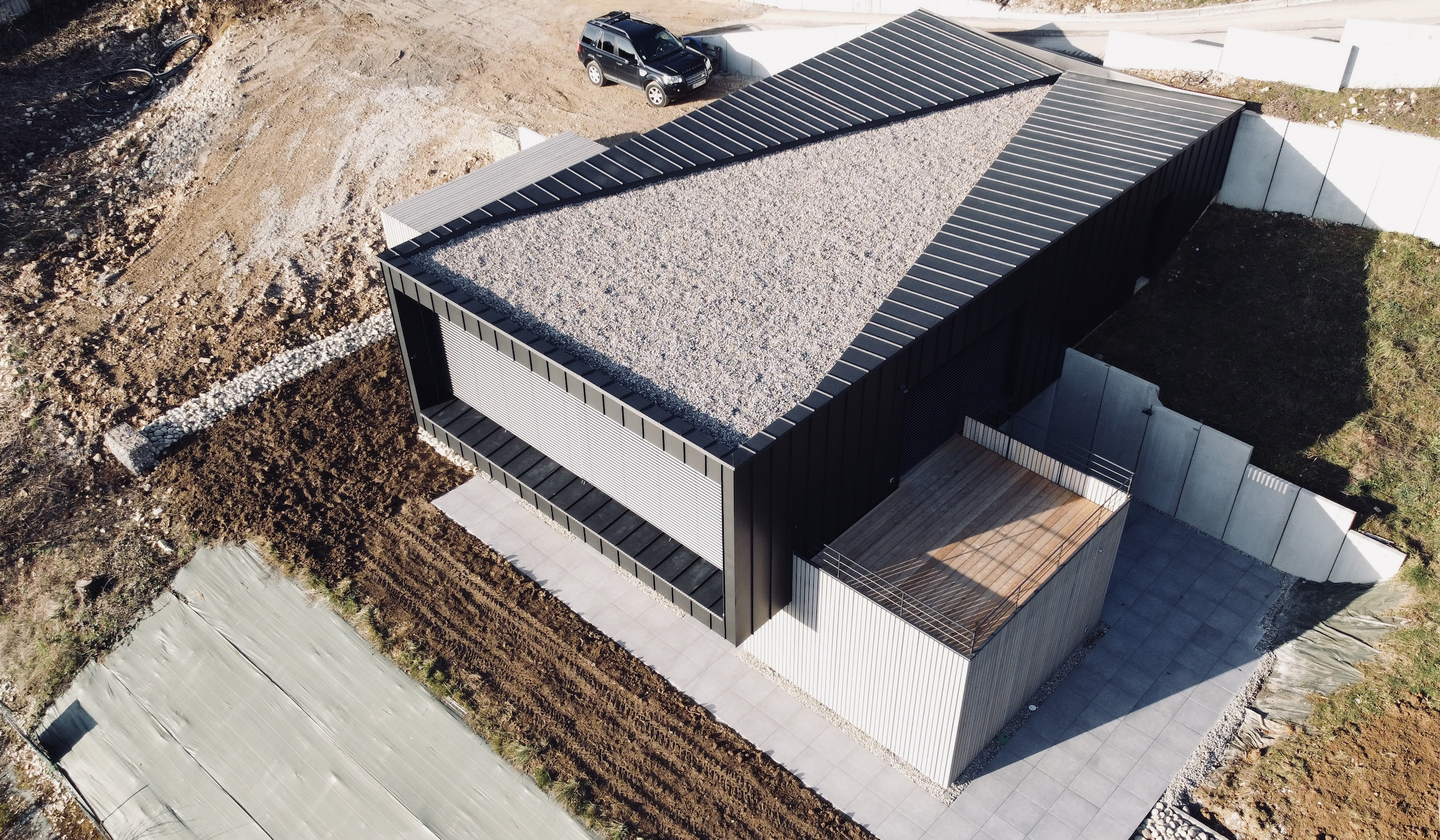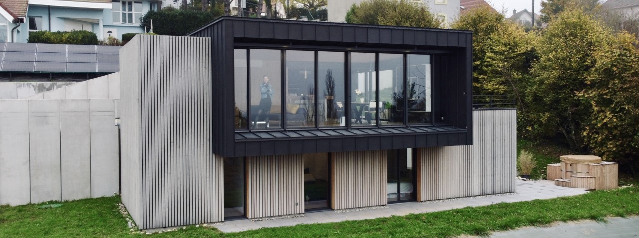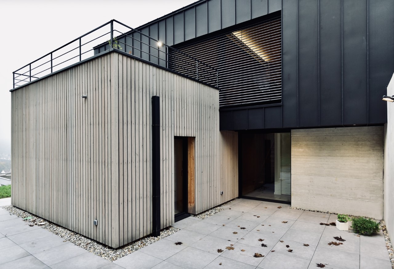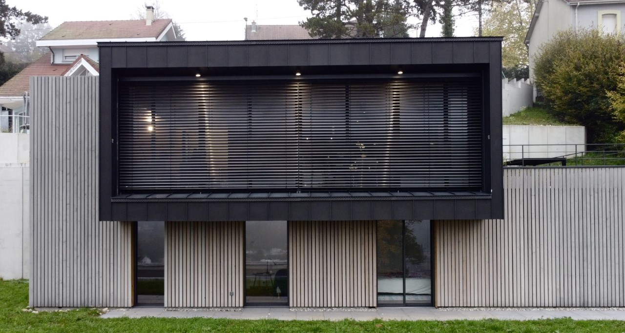 Peau du bâtiment : revêtement zinc noir / bardage bois claire-voie / béton naturel