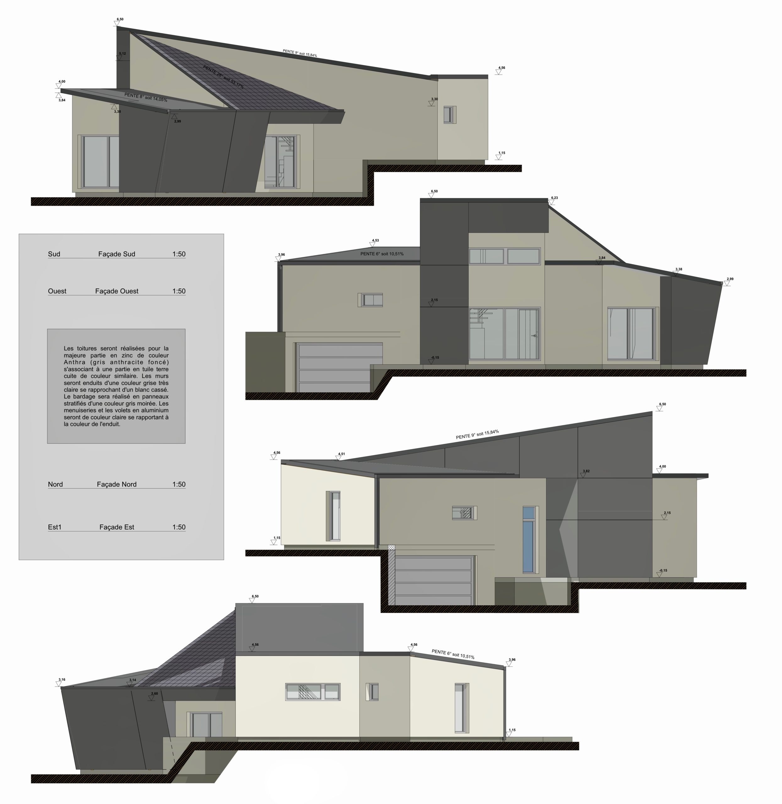 Peau du bâtiment : revêtement zinc noir / bardage claire-voie mélèze / béton naturel
