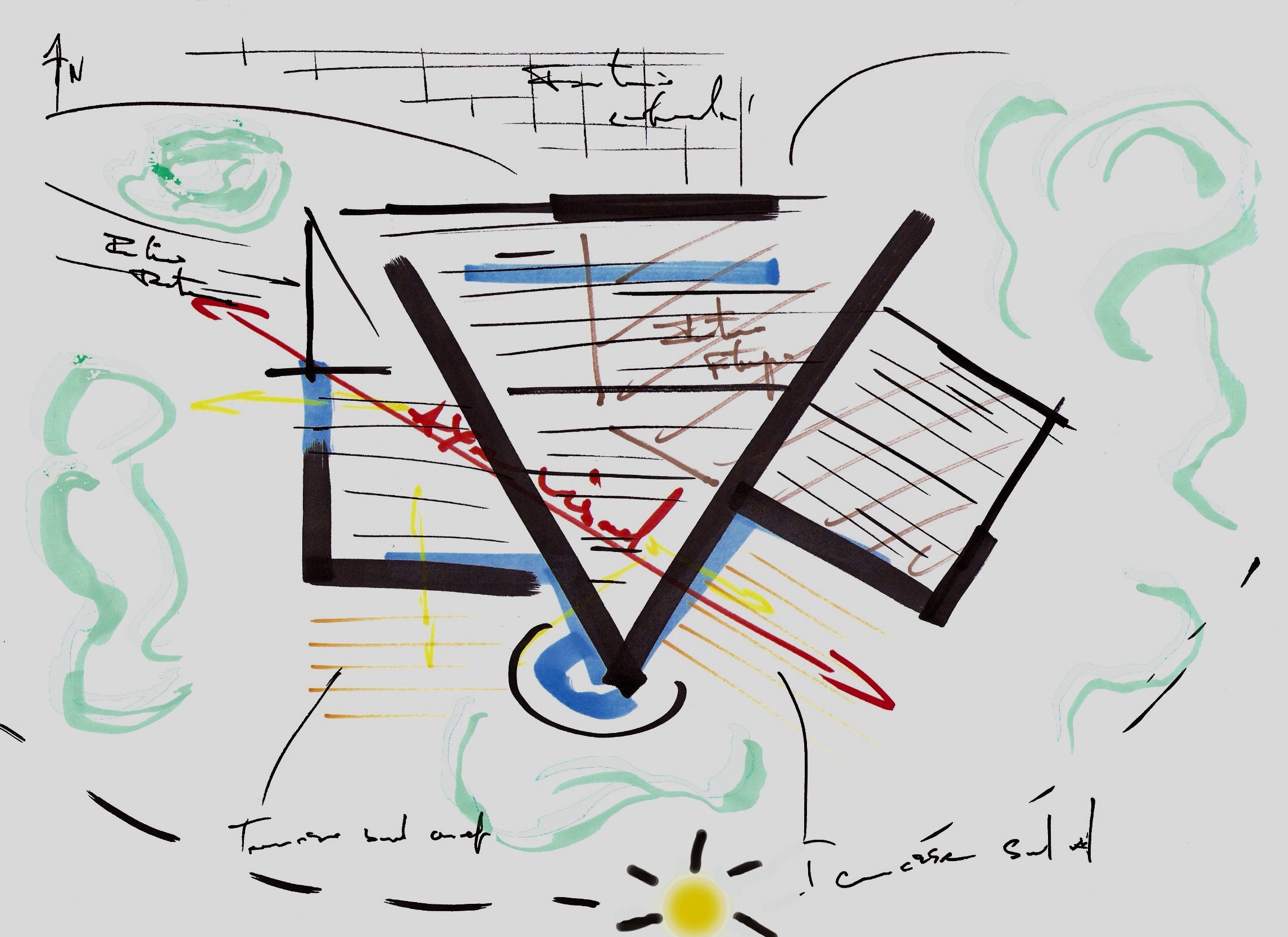 Peau du bâtiment : revêtement zinc noir / bardage claire-voie mélèze / béton naturel