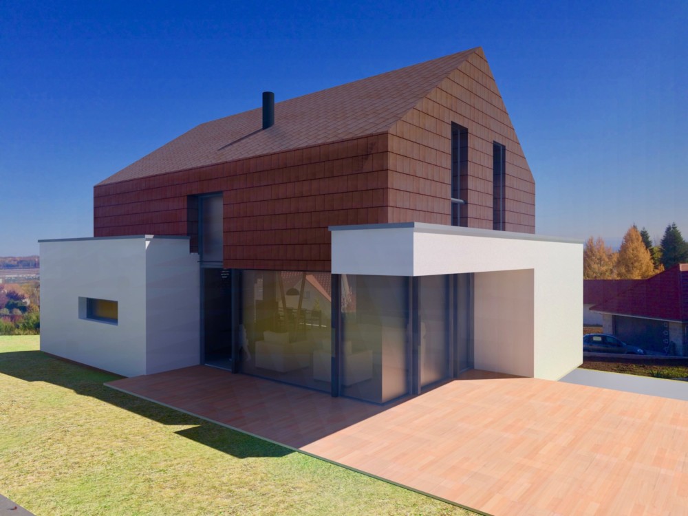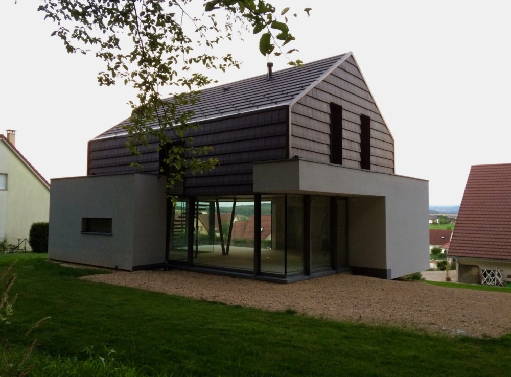 Peau du bâtiment : revêtement zinc noir / bardage claire-voie mélèze / béton naturel