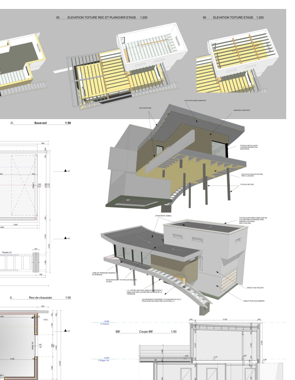 Matériaux de construction : Murs et socle en béton aggloméré et béton projeté / structure ossature bois et plancher technique bois / structure d’assemblage bois