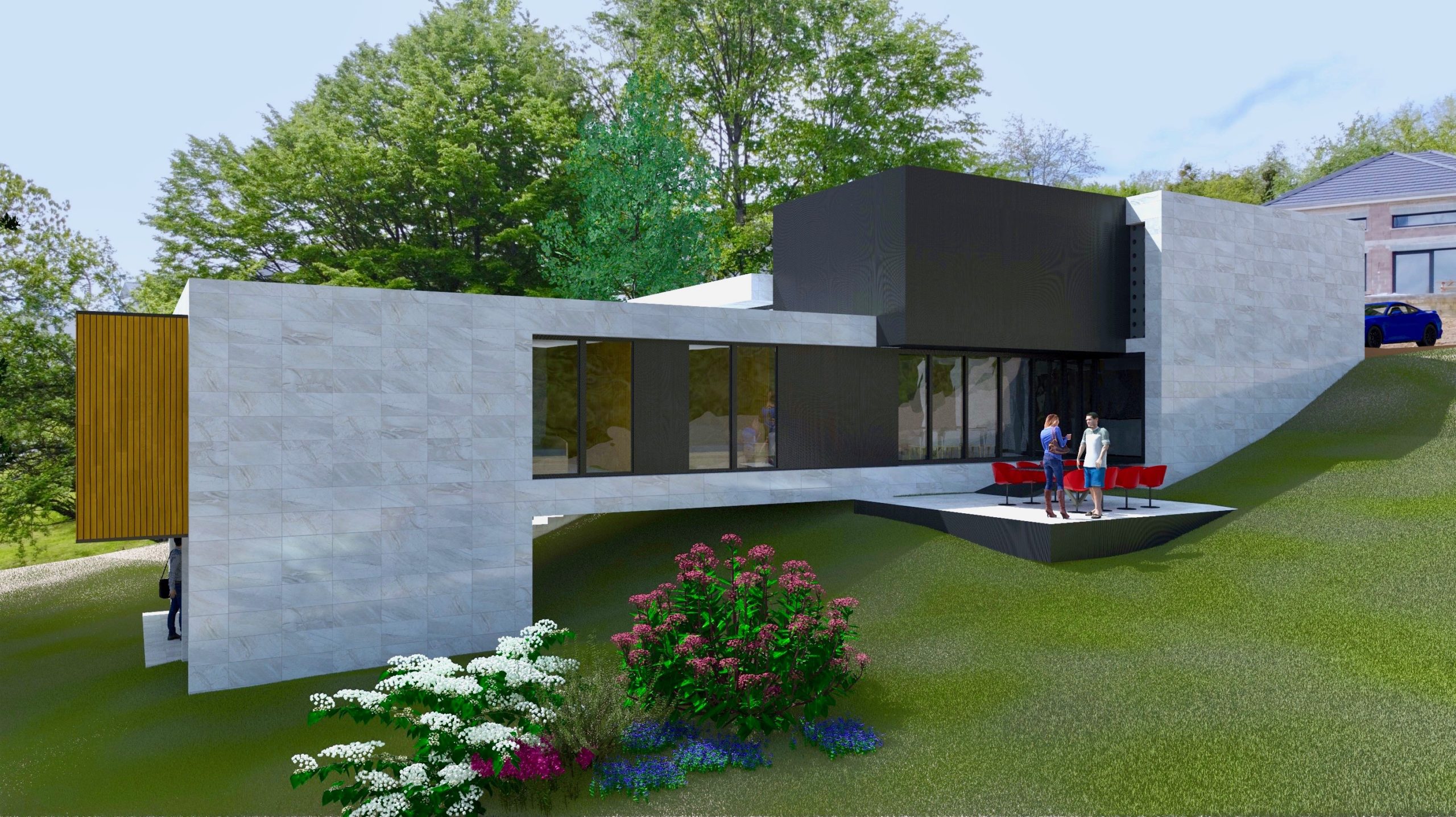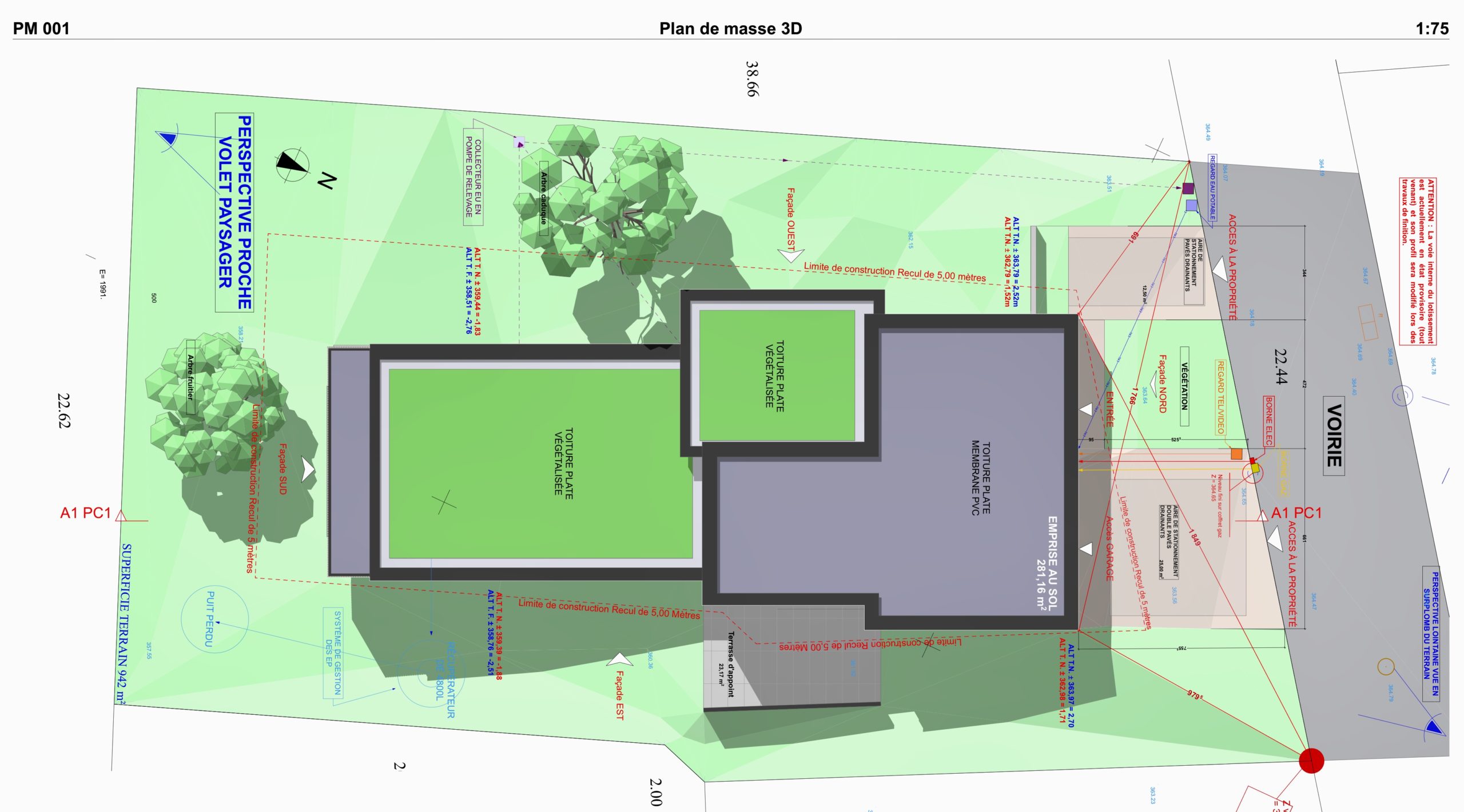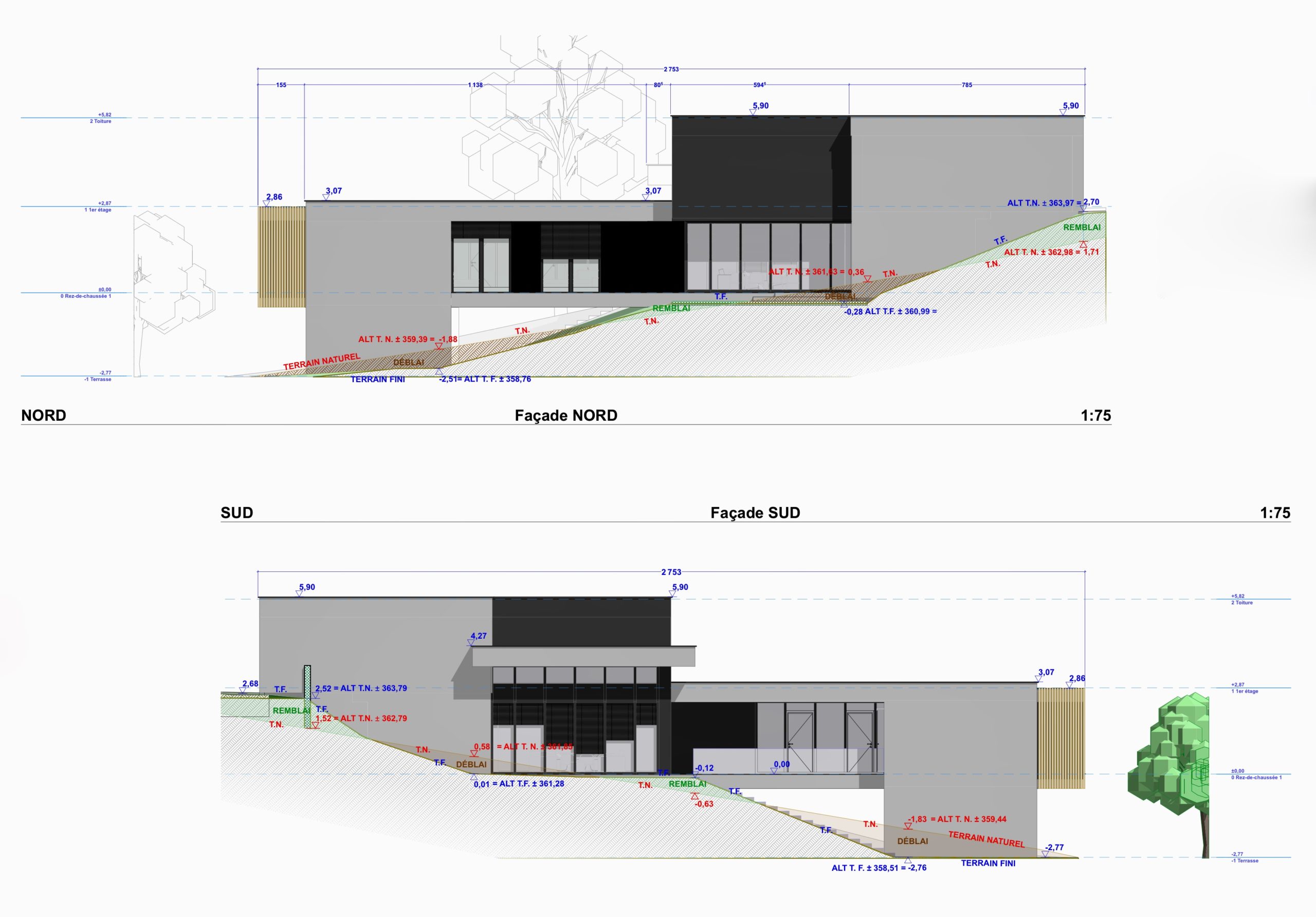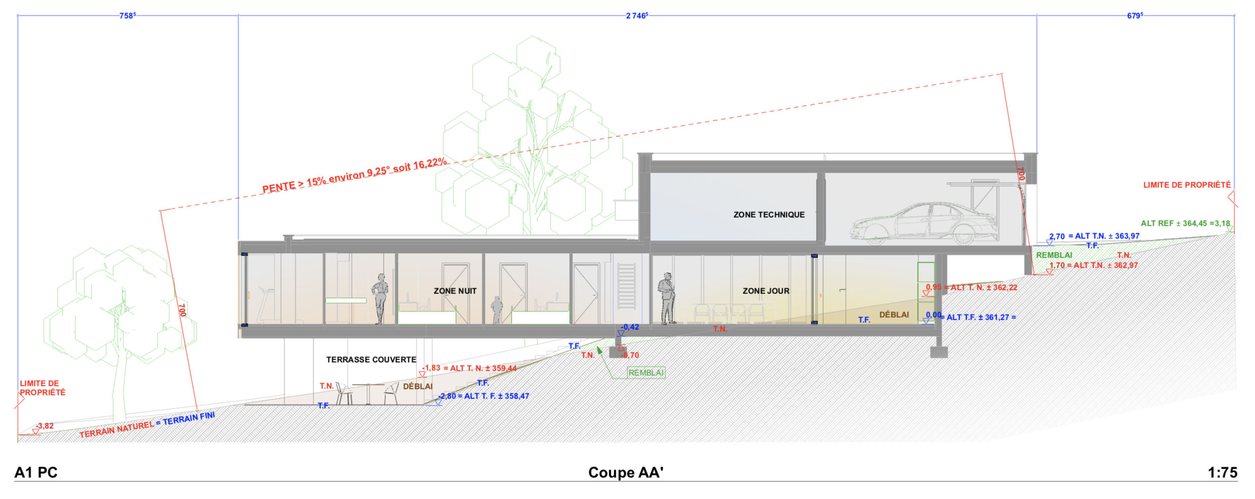 Nous sommes sur les hauteurs du village, la parcelle est excentrée du lotissement dont elle fait partie intégrante. Le terrain présente une pente non négligeable suggérant une architecture de coteau, très étroite, elle nous guide sur une forme allongée du bâtiment, à l’image d’un pont abritant une terrasse. l’articulation de cet ouvrage est une réponse à une règlementation qui stigmatise l’architecture à produire. Beaucoup d’énergie ont été nécessaire pour obtenir cet objet condensant l’ensemble des fonctions sur sa propre emprise au sol.